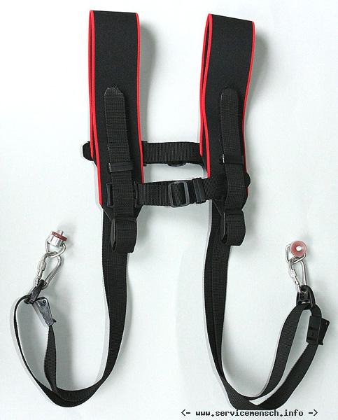 Der Doppelgurt besteht aus zwei Standard HuGus mit einer zusätzlichen Querverbindung gegen abrutschen von der Schulter gesichert ist. Durch trennen der Querverbindung kann der Doppel-HuGu auch als zwei einzelne Standard HuGus verwendet werden.