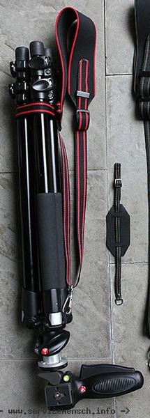 Stativgurt:Der Stativgurt benötigt eine Befestigungsöse am Stativ unterhalb des Kopfs. Dort wird der Karabiner des Gurts eingehängt und das Stativ zusätzlich mit einer Schlaufe am unteren Ende gesichert. Somit trägt man das Stativ dann kopfüber. Natürlich kommt auch hier der elastische Schulterstrap zur Dämpfung zum Einsatz.