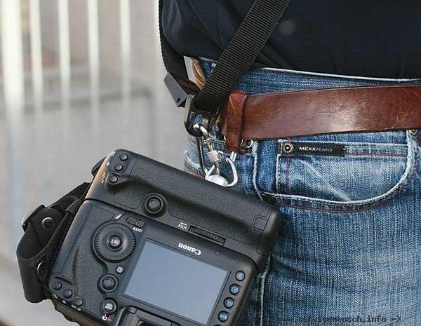Der GürtelfixDer Gürtelfix ist eine 28mm breite Gürtelschlaufe mit Haken um den Bügel der Gurtschraube (oder den Karabiner) am Köper zu fixieren. Somit wird ein pendeln der Kamera verhindert und das Gewicht auf die Hüfte verlagert. Der Gürtelfix eignet sich gut, wenn man Kindern, dem Hund oder z.B. auf dem Fahrrad unterwegs ist. Auch beim hinknien brüht die Kamera so den Boden nicht.